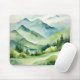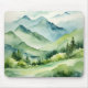 Lindas tonalidades verdes e azuis de uma cena de montanha e árvore em aquarela