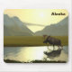 Em algum lugar do interior do Alasca um alce atravessa uma lagoa em uma tarde de outono ensolarada. À medida que o final do ano se aproxima, a luz tomou o típico tom amarelado que faz tudo parecer um pouco frágil. O sol está caindo entre as montanhas no fundo. A leitura de texto "Alaska" também é exibida.