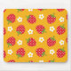 Padrão de morangos bonitos e pequenas flores em um fundo amarelo.