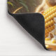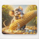Um rato feliz gosta de milho no berço com manteiga derretida enquanto se senta sobre uma superfície de madeira cercada por grãos de milho espalhados