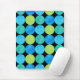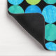 Um Mousepad de cor vibrante com um padrão de abstrato 'Luas Azuis' em azul brilhante e verde neon em fundo preto; de um design de colagem de papel pintado à mão por Judy Adamson.