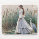 Uma mulher com um vestido branco longo caminha pela água superficial ao lado de um herão azul rodeado por sementes e talheres densas