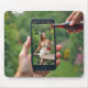 Uma mão coloca vinho tinto de uma garrafa em um copo perfeitamente alinhado com a tela do celular enquanto uma mulher sentada em um jardim assiste criando uma intrigante mistura visual de realidade digital e digital.
