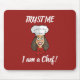 Cabeça de chef com chapéu, corcunda vermelha e texto personalizado.