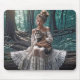 Uma mulher senta-se graciosamente sobre uma árvore caída numa floresta verde-esfarelada, mastigando um gato fofo nos braços