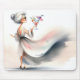 Uma mulher elegante com cabelos de cinza é representada segurando um coquetel com um guarda-chuva decorativo