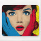 Uma mulher com cabelo vermelho e olhos azuis vibrantes cobrir seu rosto com as mãos luvadas. O fundo é brilhante com influências de pop.