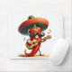 Uma pimenta vermelha antropomórfica vestindo um grande bigão e bigode preto enquanto apertava um violão