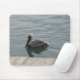 Fotografia de um pelicano marrom pendurado na água por uma doca no mouse pad