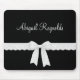 An elegant white bow and ribbon set against a striking black background, featuring a personalized name.