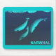Possui três narvais, Monodon monoceros, nadando sob o gelo ártico. O narwhal está relacionado à baleia de Beluga e vive no Ártico durante o ano. Encontram-se principalmente nas águas da Gronelândia e do Canadá raramente a sul de 65° de latitude norte. Os machos pesam até 1.600 quilogramas (3.500 lb), as fêmeas pesam cerca de 1.000 quilogramas (2.200 lb). O maior narwhal já encontrado pesava 3.500 libras. Têm a forma de uma beluga e cerca de 4 polegadas de gordura isolante. Os narvais normalmente se reúnem em grupos de cerca de cinco a dez indivíduos. No verão, vários grupos se reúnem formando agregações maiores. Narwhal deriva da velha palavra nár nár nórdica, que significa "cadáver", referindo-se à pigmentação cinzenta e malhada do animal, como a de um marinheiro afogado. Narbalas são mais escuras quando jovens ficam brancos com a idade. A característica mais notória do narval masculino é a sua palheta torcida de 2-3 metros (7-10 pés) de solteiro. É um dente incisivo que se projeta do lado esquerdo da mandíbula superior e forma uma hélice canhota. O nome científico do narwhal, Monodon monoceros, deriva de "um dente de trompa". A bolota pode ter até 3 metros (9,8 pés) de comprimento — em comparação com um comprimento corporal de 4-5 metros (13-16 pés) — e pesar até 10 quilogramas (22 lb). Cerca de um em cada 500 machos tem duas presas, o que ocorre quando o incisivo certo, normalmente pequeno, também cresce. Uma narval fêmea também pode produzir presas, mas isso raramente ocorre, e há um solteiro registrado de uma fêmea com presas duplas. Pensa-se que esse comportamento mantém hierarquias de domínio social. Às vezes, narvais masculinos esfregam suas presas em uma atividade chamada "usinagem". A razão para este comportamento é desconhecida; pode ser "coçar uma comichão" (a base da bolota é normalmente infestada com piolhos); ou a travessia da bolota pode ser uma saudação amigável. A teoria mais aceita para o papel da bolota é semelhante à do homem de leão ou das penas de cauda de um pavão. Pode ajudar a determinar a classificação social, a manter as hierarquias de domínio ou a ajudar os jovens do sexo masculino a desenvolverem as competências necessárias para o desempenho de funções comuns. Raramente se observaram narvais usando a sua bolota por lutarem ou por outros comportamentos agressivos ou por quebrarem gelo marinho em seu hábitat ártico. O Narwhal normalmente prossegue a um ritmo alucinante, respirando lentamente e rolando, mas são notavelmente rápidos quando se sentem ameaçados. Às vezes, eles viagem em pequenos grupos familiares e se comunicam por meio de uma variedade excelente de chiados, trilhos, assobios e cliques. Os narvais têm uma dieta relativamente restrita e especializada. A sua presa é constituída predominantemente por alabote da Gronelândia, bacalhau polar e árctico, camarão e lula Gonatus. Outros itens encontrados nos estômagos incluíram lobo, capelim, ovos de skate e, por vezes, rochas, ingeridos acidentalmente quando as baleias se alimentam perto do fundo. Desconhece-se como é que a narbaleia apanhará a sua presa. Alguns cientistas acreditam que narwhal atormentou sua presa com som, assim como golfinhos. As migrações sazonais em ondas estreitas, com alta fidelidade de retorno a zonas de Verão preferidas sem gelo, normalmente em águas rasas. No inverno, encontram-se principalmente em águas ao largo, águas mais profundas sob gelo grosso, jorrando em fissuras estreitas no gelo do mar, ou pistas. Estreito do Canadá e do inverno da Groenlândia Ocidental regularmente no gelo do estreito de Davis e da Baía de Baffin ao longo do declive continental com menos de 5% de água aberta e densidades elevadas de alabote da Gronelândia. A alimentação no inverno é responsável por uma parte muito maior do consumo de energia por narvais do que no Verão e, como predadores marinhos, são únicos na sua exploração bem sucedida dos ecossistemas árcticos de profundidade. O mais notável de suas adaptações é a capacidade de realizar mergulhos profundos. Quando no inverno, as entrelinhas fazem alguns dos mergulhos mais profundos já registrados para um mamífero marinho, mergulhando a pelo menos 800 metros (2.400 pés) em 15 vezes por dia, com muitos mergulhos chegando a 1.500 metros (4.500 pés). Os mergulhos nestas profundidades duram cerca de 25 minutos, incluindo o tempo passado no fundo e o trânsito para baixo e para trás a partir da superfície. Nos locais de Verão mais rasos, os narvais mergulham a profundidades entre 30 e 300 metros (90-900 pés). Os únicos predadores de narvais além dos humanos são ursos polares e orcas. As pessoas de Inuit podem caçar legalmente esta espécie de baleia para subsistência. O clima norte fornece pouca nutrição sob a forma de vitaminas que só podem ser obtidas através do consumo de foca, baleia e morsa. Quase todas as partes do narval, carne, pele, gordura e órgãos são consumidas. Mattak, a palavra para pele crua e gordura, é considerada uma iguaria, e os ossos são usados para ferramentas e arte. Em alguns lugares na Groelândia, como o Qanaaq, são usados métodos tradicionais de caça, e as baleias são apedrejadas a partir de caiaques feitos à mão. Noutras partes da Gronelândia e do Canadá norte são utilizados barcos de alta velocidade e rifles de caça. Embora as populações pareçam estáveis, o narval foi considerado particularmente vulnerável às alterações climáticas devido a uma área geográfica restrita e a uma dieta especializada. Os narvais que foram trazidos para cativeiro tendem a morrer rapidamente. Na lenda Inuit, a bolota do narval foi criada quando uma mulher com uma corda de arpão amarrada em torno da cintura foi arrastada para o oceano depois que o arpão atingiu um grande entrelaçado. Ela se transformou em uma narval, e seu cabelo, que ela vestia em um nó torcido, se tornou a característica d