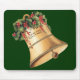 Ilustração Vintage design de Natal Feliz, com um sino de ouro decorado com folhas sagradas e frutas vermelhas. Um corte antigo. Texto: Cartões de natal.