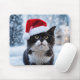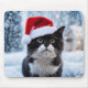 Gato branco e preto vestindo um chapéu de Papai Noel.