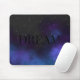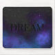 Mouse pad com a palavra "sonho" em letras maiúsculas negras sólidas contra um céu noturno estrelado e preto suave em meio a nuvens de espaço nebuloso azul e roxo. Sutil, escuro e profundo como o misterioso reino dos sonhos. Use o modelo de texto para adicionar um nome ou uma citação curta inspiradora. ♡ Idyllfire