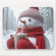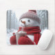 Um bonitão vestido de chapéu vermelho, cachecol e luvas segura uma caneca de chocolate quente tocada com marshmallows
