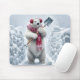 Um urso polar se posou sobre um caminho de neve, vestido de algema vermelho e um cachecol segurando uma pá de neve.