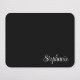 Crie seu próprio mouse preto e branco para sua filha voltar para a escola. Adicionar um monograma corajoso e colorido para personalizar o design. Um guião branco e curly para o seu nome sobre uma cor sólida de fundo preto. Altere o estilo, o tamanho e as cores da fonte para corresponder ao seu estilo pessoal.