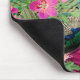 Mousepad elegante e vintage com um pavão azul brilhante e flores roxas e cor-de-rosa sobre um fundo de notas musicais verde e preto.