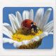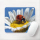 Sete manchas (Coccinella septempunctata) no coração da flor da margarida no fundo do céu azul