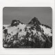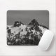 Uma fotografia a preto e branco de dois picos na Faixa Tatoosh conhecida como O Castelo e o Pinnacle. A cordilheira está coberta de neve apesar de ser verão. Há árvores e pedras espalhadas sobre a paisagem e as montanhas. A posição do sol permite que sombras sejam lançadas na montanha. As nuvens incógnitas adoram o céu. Imagem Copyright ©2023 Kimberly J Tilley. zazzle.com/store/developingnature