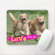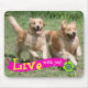Este mousepad caracteriza uma fotografia de dois cães do golden retriever que funcionam feliz através de um campo verde. O subtítulo lê, "vive com a alegria!"