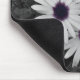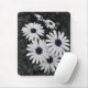 Esta imagem mostra um aglomerado de margaridas com pétalas brancas e polos púrpuros-azuis em greve. O fundo e a folhagem estão em preto-e-branco, criando um efeito colorido seletivo que enfatiza as cores vívidas dos centros das flores. O contraste entre os arredores dessaturados e as delicadas flores dá à imagem uma qualidade artística, quase surreal, destacando a beleza e a complexidade da natureza.