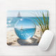 A sailboat on a sunlit ocean, its reflection captured in a glass lens ball on beach sand next to a starfish