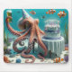 Um polvo vestindo uma festa que segura uma cerveja e se senta ao lado de um bolo de aniversário debaixo d'água.