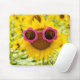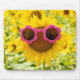 Óculos de sol cor-de-rosa sobre girassol num campo de girassol.