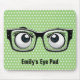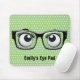 Olhos grandes com pestanas e óculos de estrutura preta em um padrão de bolinhas branca com fundo verde. O plano de fundo e o texto podem ser alterados.