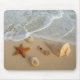 Alguns seashells, um diabrete de mar, & um resto da estrela do mar na areia como uma onda rolam dentro.