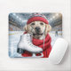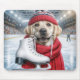 Um Retriever de Ouro vestindo um gorro vermelho e cachecol segura um skate de gelo na boca enquanto está em pé em uma pista de gelo