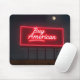Um grande sinal de neon vermelho com as palavras "Comprar Americano" brilha intensamente contra um céu noturno, com uma lua de cheio visível acima