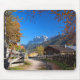 Mousepad com uma paisagem rural com uma estrada, um celeiro e as árvores em cores da queda e em uma vista para montanhas das dolomites de Geisler ou de Odle no outono no vale de Funes dos di de Val em Tirol sul, Italia.