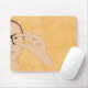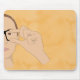 Este mouse pad é impresso com um design desenhado à mão, com uma mulher assinando o sinal ASL de GLASSES em um fundo laranja.
