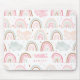 Pasta de rato com padrão de arco-íris pastel e branco. Há também nuvens e gotas de chuva. A design...