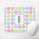 Este mouse pad apresenta um padrão pastel de bolinhas arco-íris com um monograma no centro que pode ser personalizado.
