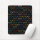 Uma cobertura de mouse de hipster giro com um padrão colorido de óculos em amarelo, vermelho, cinza, azul, verde, rosa e branco sobre um fundo preto. Esses óculos de tendência adicionarão uma aparência peculiar e exclusiva ao seu espaço de trabalho.