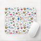 Este trabalho de arte apresenta um padrão que inclui vários símbolos relacionados ao orgulho gay num design colorido.