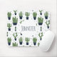 Mousepad personalizado com sabor ocidental rústico. Projetado com um monte de cactos verdes bonitos em um padrão repetitivo. Especificamente, cacto cor verde picante, em todos os tipos de formas e tamanhos, cada um sentado no seu pote de flor azul escura. Pequenos triângulos decorativos entre eles. Ilustração engraçada.