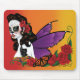 Dia do crânio de açúcar da fada morta com asas roxas. Rosas vermelhas e borboleta monarca num pano de fundo do pôr do sol de vermelho, amarelo e laranja.
