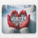 Luvas vermelhas contendo texto branco de "inverno" com flocos de neve na cena da floresta de inverno