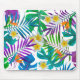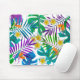 Folhas tropicais coloridas de palmeiras, monstera, flores de plumeria e aves do paraíso