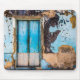 Enquanto caminhava pelas ruas nas pequenas aldeias das ilhas Cabo Verde, fiquei impressionado com a incrível mistura de cores, texturas e materiais que oferece belas oportunidades para fotografias urbanas. Nesta imagem: parede azul, bege e marrom e uma porta azul.