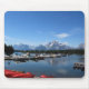Parque Nacional Grand Teton. O lugar mais bonito da América. A foto mostra o belo céu azul, lago, montanha, barcos e árvores. Em todo lugar parece uma foto no parque.