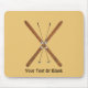 Pincéis cruzados de madeira e bastões de esqui num fundo de pele de fivela. Você pode escolher outra cor de fundo. Adicione seu próprio texto.