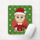 Design com uma ilustração de uma menina feliz sorridente com cabelo loiro curto, ela está vestindo a fantasia vermelha e branca do Papai Noel e segurando um presente; design de Natal com um fundo verde sem soldadura com estrelas