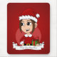 Design com uma ilustração de uma menina feliz sorridente com cabelo comprido e castanho, ela está vestindo fantasia de Papai Noel vermelho e branco e segurando um presente; com texto editável modelo para seu nome ou mensagem, design de Natal com fundo vermelho