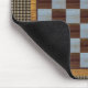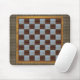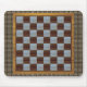 Um mouse pad com um tabuleiro de xadrez e um legal fundo de bolas metálicas.