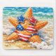 A whimsical starfish in a red, white, and blue American flag bikini lounges on a sandy beach, sporting star-shaped sunglasses that enhance its playful look